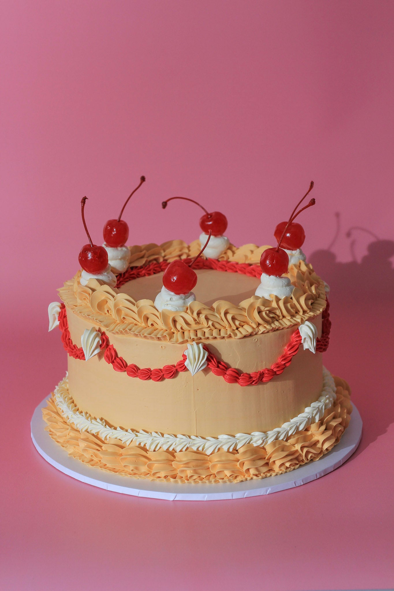 This cake is all about the detail! Stunning vintage piping topped with cherries, for the ultimate classic cake design. Frills for days! Customise your shape, base colour, piping colours and piped message.
